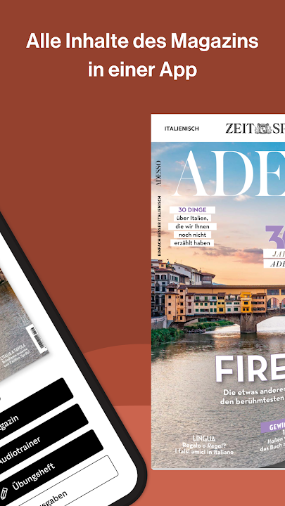 這本電子雜誌透過採訪、專欄和報告提供有關義大利語言和文化的令人興奮的最新見解。每本電子雜誌包含約 70 頁對義大利生活方式的見解以及三個層面的合適練習:簡單 (A2) - 中等 (B1-B2) - 困難 (C1-C2)。該內容是專門為德語學習者量身定制的教學內容。只需單擊一下,您就可以直接聽到文字中的適當音訊內容。