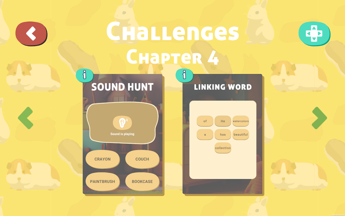 《我的倉鼠在哪裡》提供了許多章節,每個章節都有一組可供您玩的關卡。當您在遊戲中找到並發現一個物體時,您將了解該物體的名稱、詞彙、發音、描述、例句和圖像。還有多種很酷的小遊戲供您選擇,例如填寫句子、猜測圖片、將單詞與正確的圖像匹配等等。所有這些小遊戲都有助於刷新您在主要遊戲玩法中學到的知識,同時刺激您的大腦。