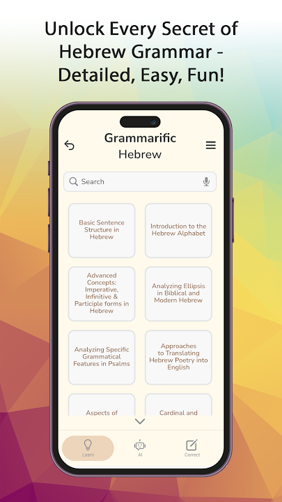 "Dive into the ancient and vibrant language of Hebrew with "Grammarific Hebrew," your comprehensive mobile assistant for learning and mastering Hebrew grammar. Ideal for language learners at various levels, this app offers a systematic approach to the grammatical foundations and complexities of modern Hebrew.