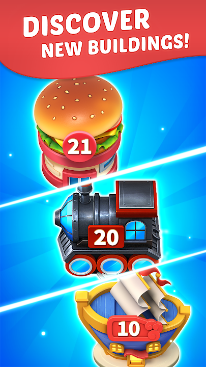 在这个令人上瘾的闲置游戏中合并建筑物、经营和发展您的城镇!