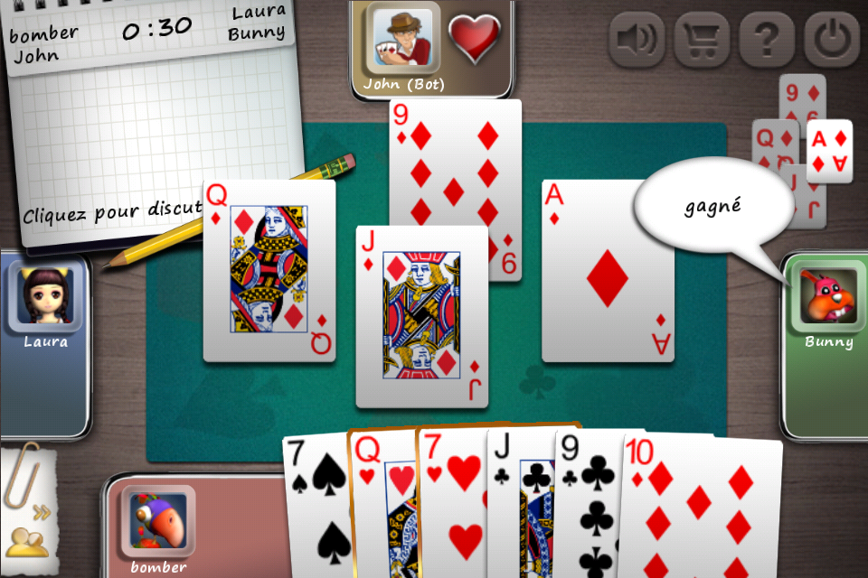 iBelote Online是Belote在Internet上的遊戲。特點:-Internet上的多人遊戲,自動選擇合作夥伴。-標準和Coinche遊戲模式(國家/地區)-完全使用法語。