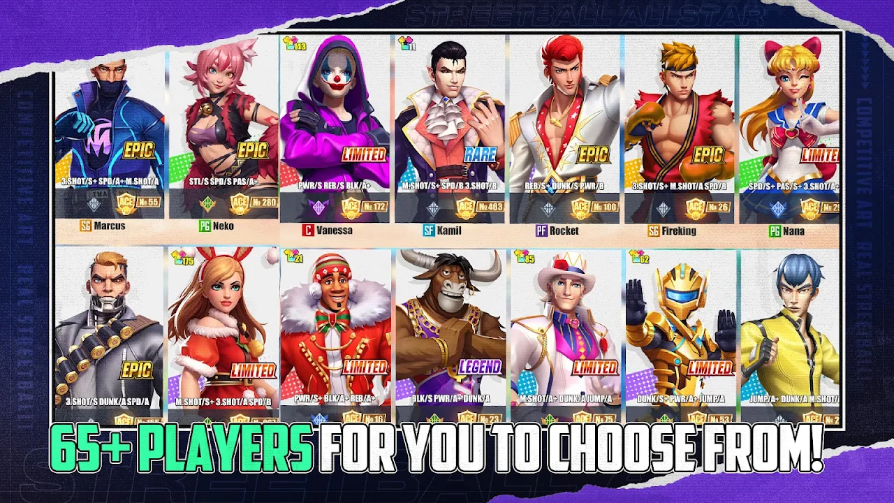 Collect multiple characters with different positions: Center, Power Forward, Small Forward, Point Guard, Shooting Guard. Find the characters that suit your playing style, hone your skills to outperform other players, and win MVP!