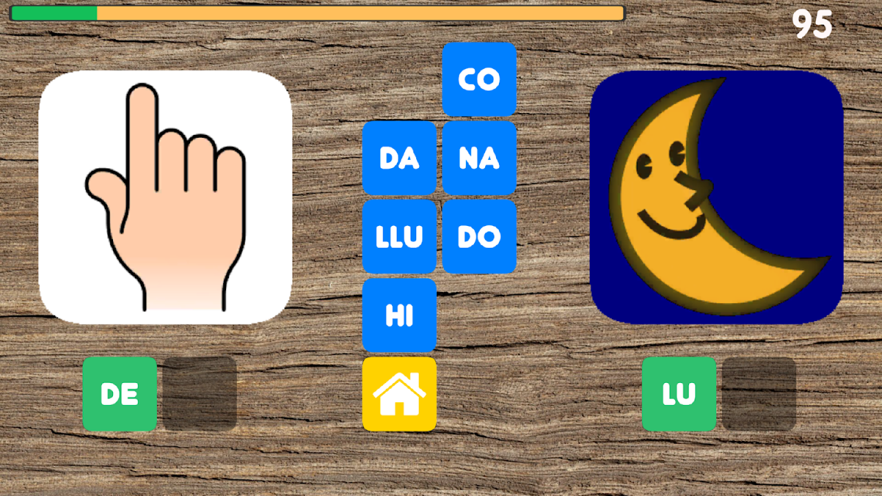 A game to learn to write with the syllables of the Spanish language. Two images of Spanish words composed of two syllables are presented, for example CASA and MOTO. The game consists of choosing the correct syllables to write the two words. When all the correct syllables have been selected, the game continues with two new words.