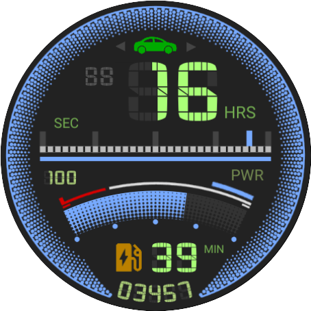 互动元素:顶部的转向信号灯可根据手表的倾斜度做出反应。这也会触发日期和星期几。左转是日期,右转是星期几。