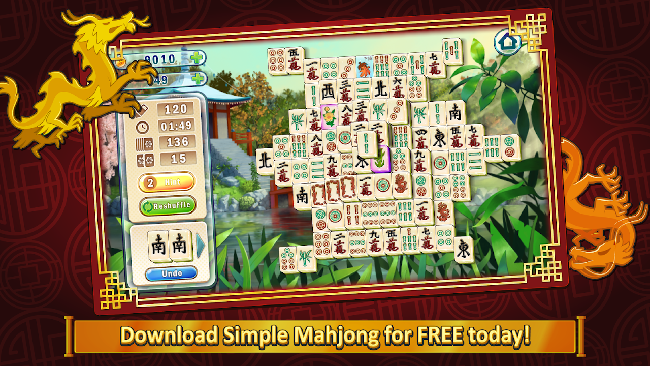 啟動簡單麻將,你會直接進入遊戲 - 沒有跡象起坐或賬戶進行。每天享受一個新的水平與日常拼圖功能。也有50+級解鎖,分解成有趣的類別所有的經驗水平。自定義不同的背景樣式和麻將牌的遊戲體驗。你將無法放下這個有趣和輕鬆的益智經典!