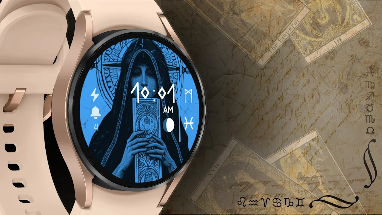 凝视您的手腕,然后“洗牌”,就像大阿卡纳牌在幻灯片中随机播放一样(暂停在始终显示的屏幕上,并附带随机的符文符号,以防您知道您的象征意义)。您可以选择鲜艳的色彩或柔和的色彩方案来适应您想要表达的任何氛围。这款表盘既时尚又实用。