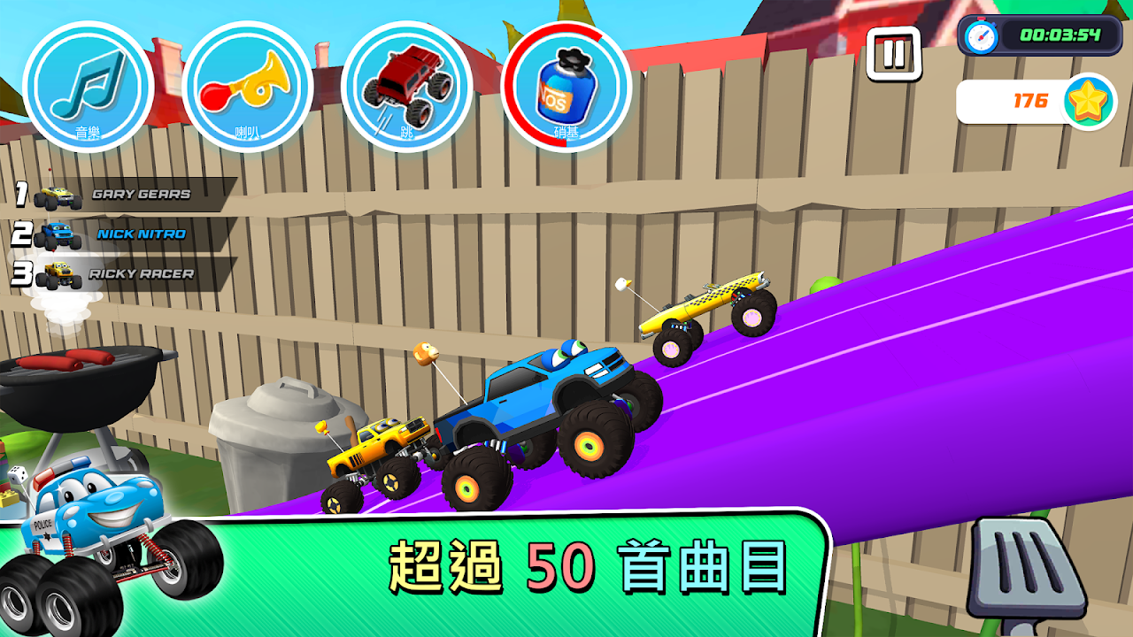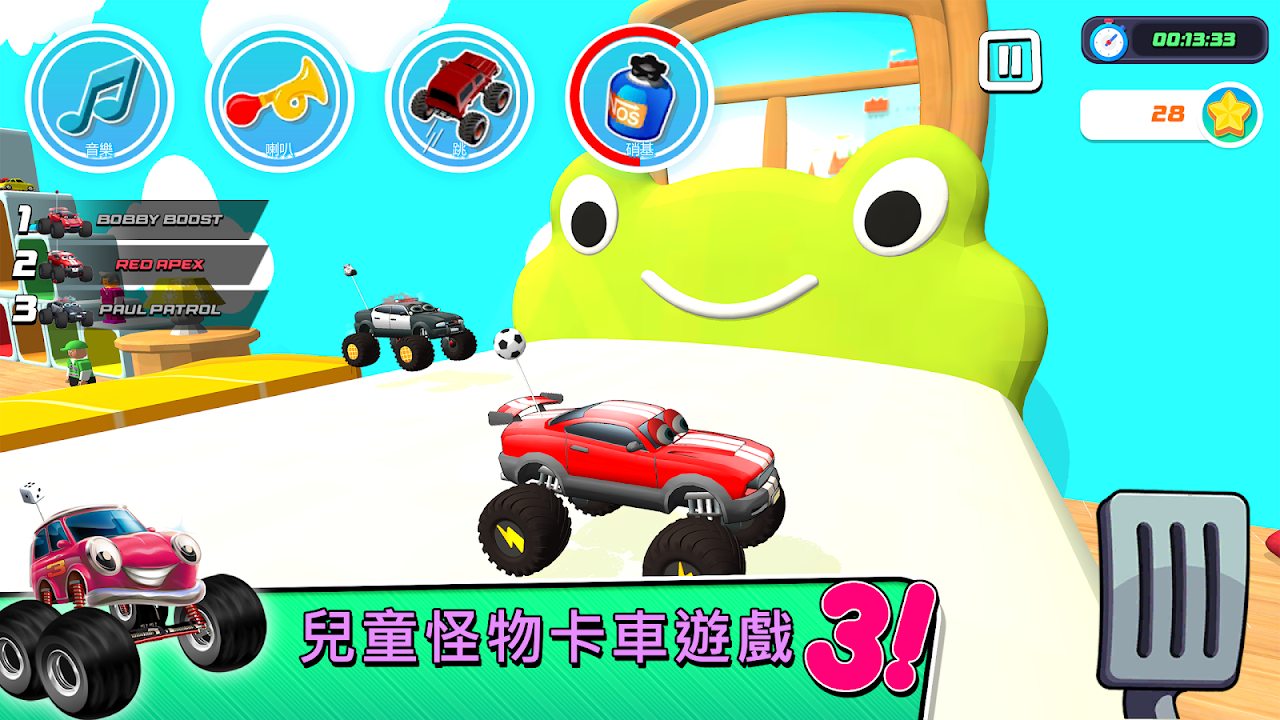 有趣的彩色按鈕可以跳躍、按喇叭並更改音樂曲目或激活硝基以在其他汽車之前加速。解鎖新的天線和輪子來點燃你的怪物卡車。