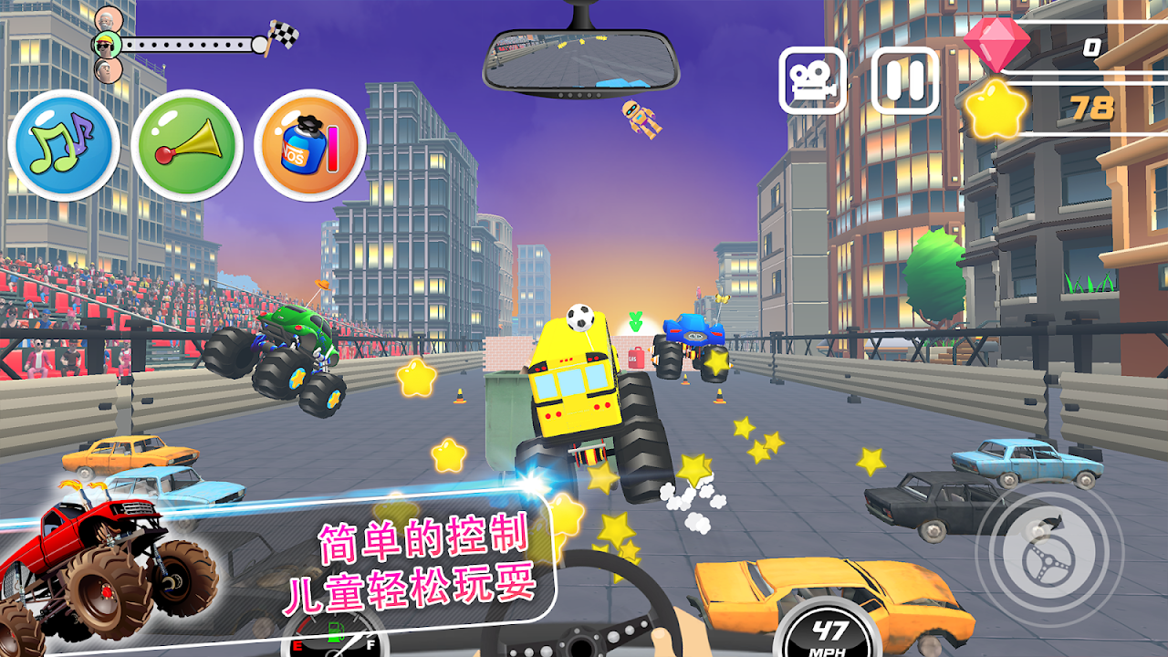 有趣的彩色按钮可以发出喇叭声并改变音乐曲目或激活硝基领先其他汽车。解锁新的天线、车轮、配件和驱动器,让你的巨型卡车在赛道上大放异彩。