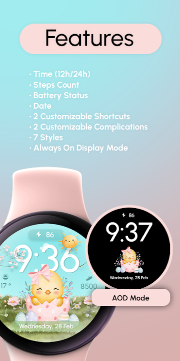 Introducing the Wear OS Easter Watch Face! 🐰🌸 Get into the spring spirit with this delightful watch face adorned with pastel colors, featuring adorable bunnies and cute chicks. 🐣⌚️ Perfect for adding a touch of Easter charm to your smartwatch this season! 🌷✨