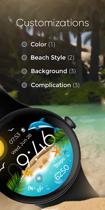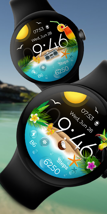 Summer Vacation Watch Face is a customizable watch face that captures the essence of the beach and vacation vibes. It features palm trees, dolphins, flamingos, and tropical parrot, all of which can be customized according to your vacation preferences. This watch face allows you to personalize it to your liking, bringing a touch of your favorite vacation memories right to your wrist.