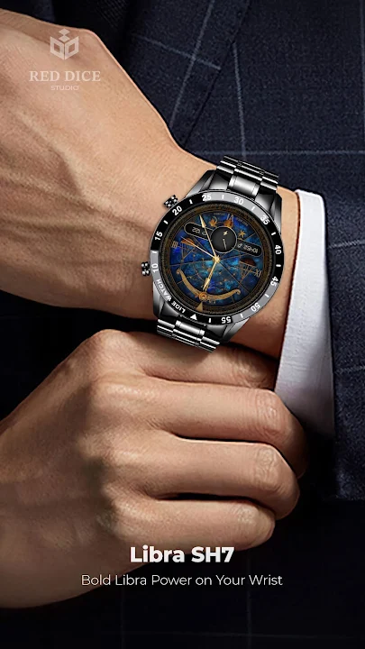 Discover Libra SH7, a meticulously designed watch face that blends artistry with practicality. Inspired by the Libra zodiac sign, this timepiece showcases a golden balance scale against a deep cosmic background, symbolizing harmony and precision.