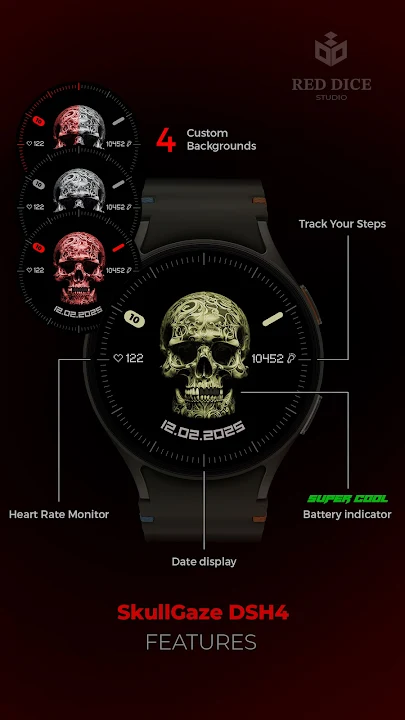 SkullGaze DSH4 是一款由 Red Dice Studio 设计的引人注目的表盘,其大胆的骷髅主题设计将艺术与功能融为一体。它专为渴望脱颖而出的人士打造,拥有动感的指针样式和多种鲜艳的骷髅背景——包括分色和毒光变体。