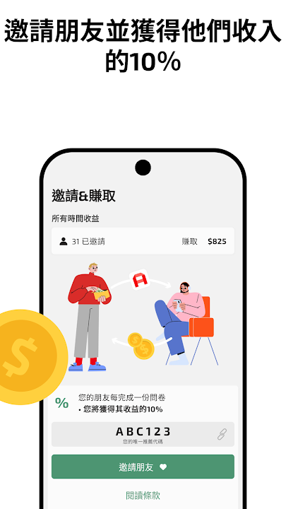 豐厚的推薦計畫:您可以獲得好友調查收入的 10%。