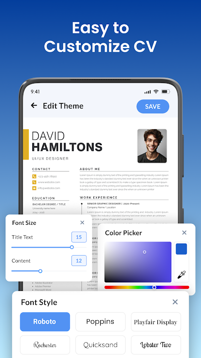 应用提供用户友好的引导和可自定义的模板,帮助求职者制作吸引招聘人员注意的简历。你可以选择多种简历格式,编辑内容,实时预览设计,并将简历导出为 PDF 或图片格式,无需联网即可使用。