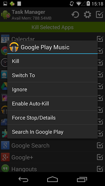 * context menu to switch, uninstall, ignore, auto-kill or search application