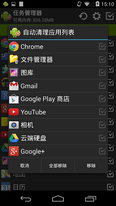 * 上下文菜单用以切换,删除,忽略,自动清理或在Google Play中定位应用
