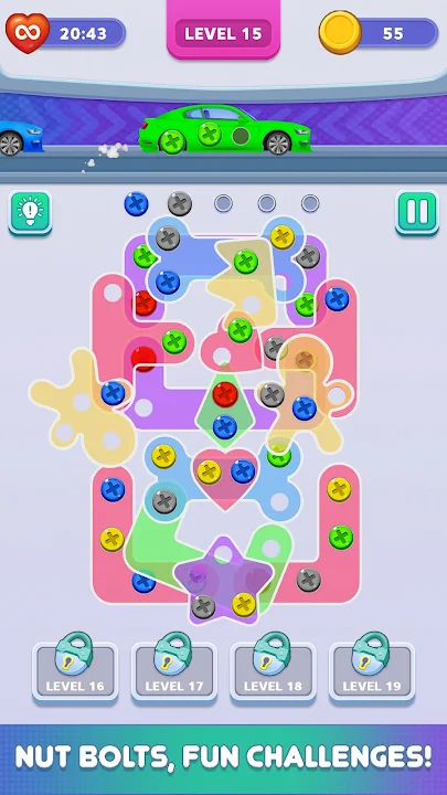 Screw Nut Bolt Puzzle is an engaging and strategic game where all shapes pinned by stubborn screws. The objective is to strategically remove all the screws to break down the structures and solve the puzzle. Each level presents a unique challenge, requiring careful planning and problem-solving skills. You must place removed screws in limited spots, adding an extra layer of difficulty. With hints and tools available to assist, the game offers a satisfying blend of strategy and fun. Can you unscrew every last bolt and conquer the puzzle?