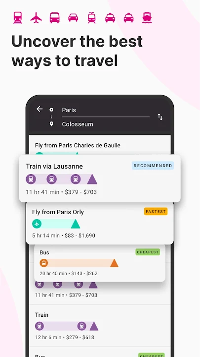 Planning your next trip can be exciting but also complicated. That's where the Rome2Rio travel app comes in handy! Use it to research, compare, and coordinate your transport options across 240 countries and territories around the world. Whether you prefer to travel by train, ferry, bus, plane, or car, you’re sure to find the right trip that suits your needs.
