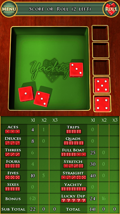 A game of Yachty Deluxe consists of 13 rounds. In each round, you roll the dice and score the result in one of 13 categories.You must score exactly once in each category, so skill and judgment are required as the game progresses and your options start to run out. The aim of the game is to make the biggest score you can from the 13 rounds.