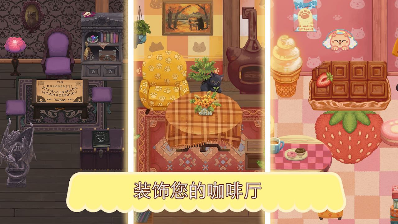 ● 定制您的咖啡厅!无论是地板还是墙壁,咖啡厅的一切都完全由您定制。这样您就随心所欲地创造属于自己的空间。您想把咖啡厅变成一座可爱的猫咪游乐场?还是一个哥特风的小窝?这完全起决于您!