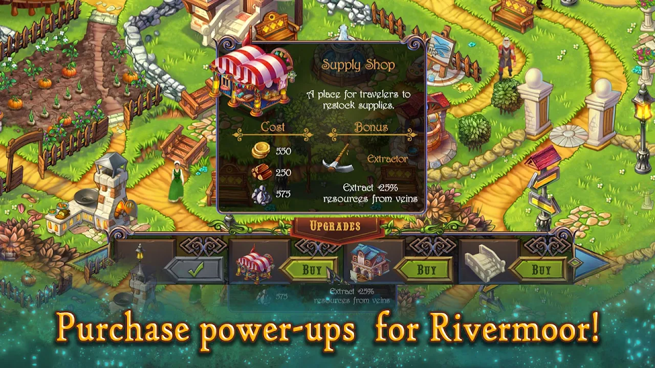 Match 3 or more gold, stone, and wood pieces to earn those resources. The larger the match, the more resources you receive. Use your resources to help rebuild the town of Rivermoor. Rivermoor is an old time medieval village that was abandoned during the war and has a remaining population of only 3. They desperately need an extra hand to earn enough to pay their dues to the royal King!