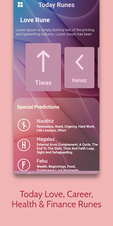 ● On this app, you can know about Rune symbols: Fehu Rune, Uruz Rune, Thurisaz Rune, Ansuz Rune, Raido Rune, Kaunaz Rune, Gebo Rune, Wunjo Rune, Hagalaz Rune, Nauthiz Rune, Isa Rune, Jera Rune, Eihwaz Rune, Pertho Rune, Algiz Rune, Sowulo Rune, Teiwaz Rune, Berkana Rune, Ehwaz Rune, Mannaz Rune, Laguz Rune, Ingwaz Rune, Othala Rune, and Dagaz Rune in detail.