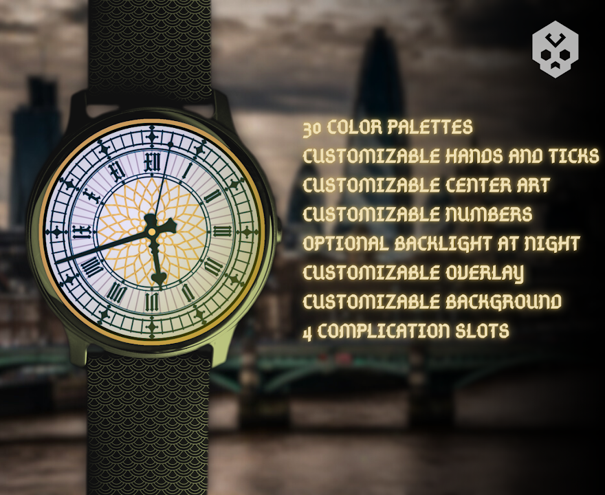 A watch face built to look exactly like a digital version of the famous Big Ben clock tower, featuring an amoled friendly mode, highly customizable and with 4 complication slots!Introduction