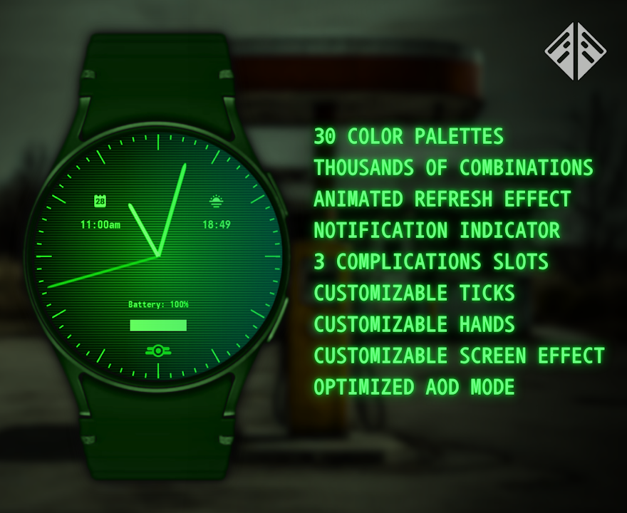 A stylish, customizable and atomic pip watchface, directly from the wastelands!