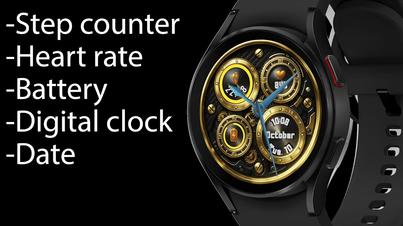 豪华混合金表盘 — 模拟 + 数字,带有心脏、步数和电池。