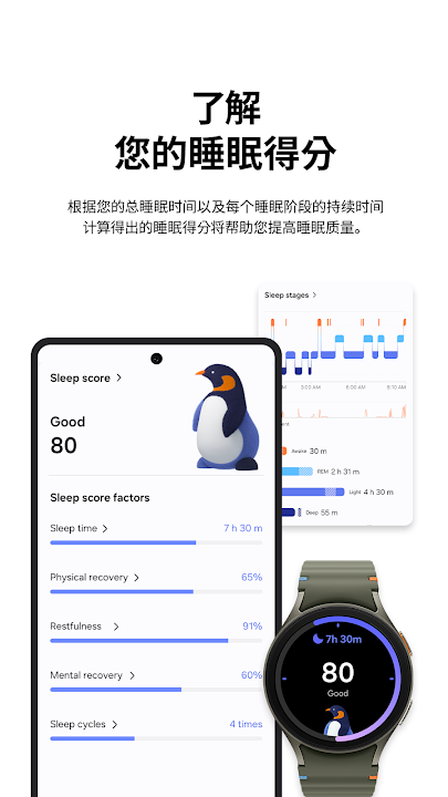 优质的睡眠是美好一天的关键。用 Galaxy Watch 更详细地监测您的睡眠模式。通过睡眠水平和睡眠得分来提高睡眠质量,让您在早晨更加神清气爽。
