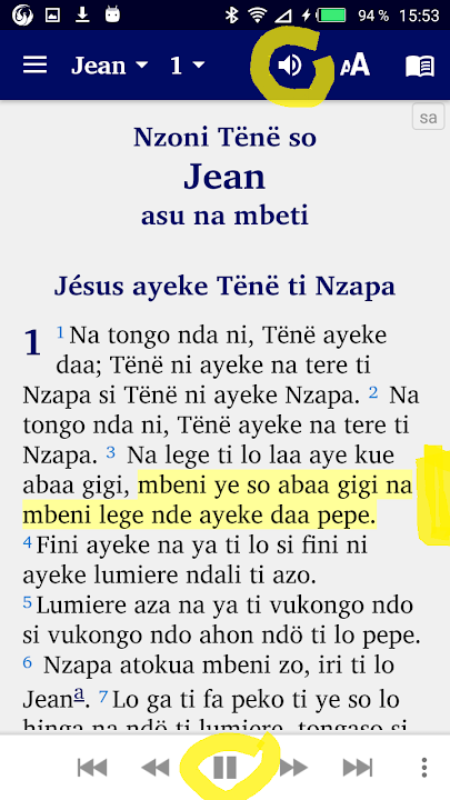 該應用程序將上帝的話語(聖經)翻譯成中非使用的桑戈語。如果您按右上角的小“書”圖標,您可以更改屏幕上的窗口:現在選擇