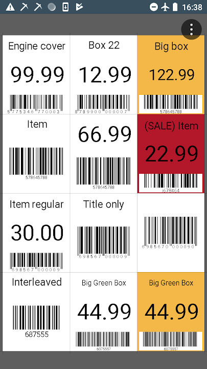每个标签都可以包含产品名称,产品价格和条形码或其中任何一种。 有2页的布局。