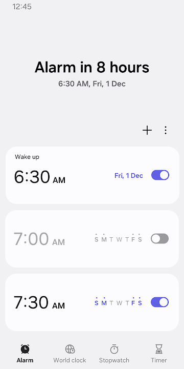 This feature allows you to assign dates to alarms, and repeat alarms can skip one day and be turned on again. The Snooze feature allows you to create the same effect as setting multiple alarms.
