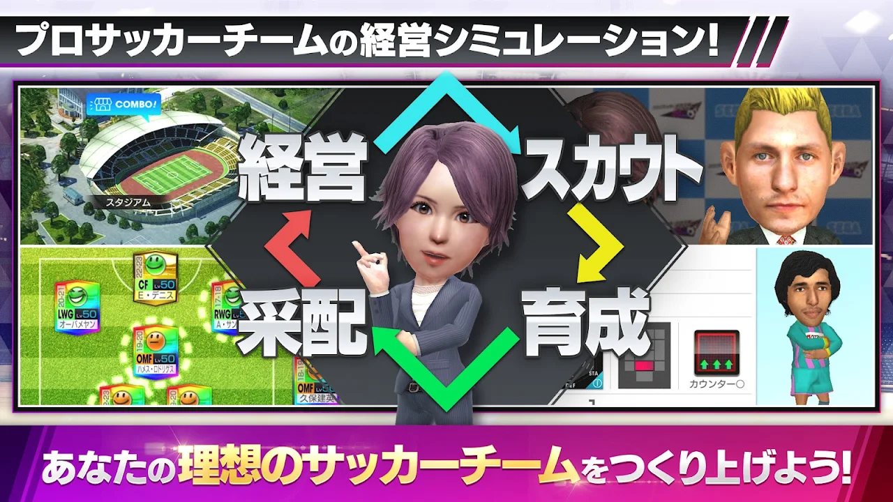 "Sakatsuku" is now available as a smartphone game! In addition to the royal road system that follows the conventional “Sakatsuku” of soccer management x professional development x reinforcement x match, a new system that can only be used as a smartphone game is installed. Compete with players from all over the world to become the "World's No. 1 Soccer Club"!