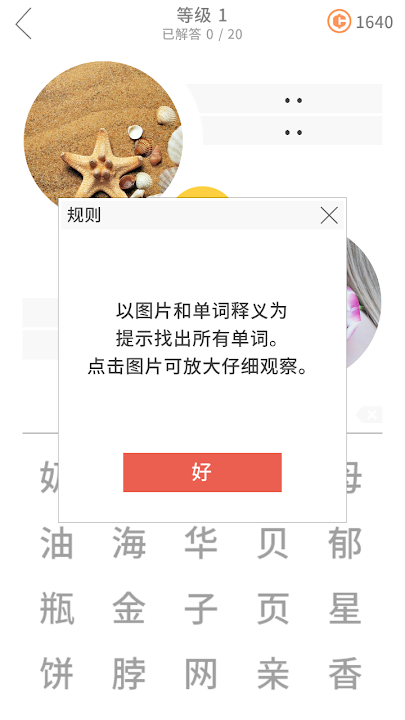 每个等级包含20个打乱的单词,带图片和单词释义。找出这些单词,解答所有的游戏等级!你可以点击图片放大以便更细致地观察。有些答案很直截了当,有些却很难解哦。享受这款让人欲罢不能的考验脑力的难题吧!