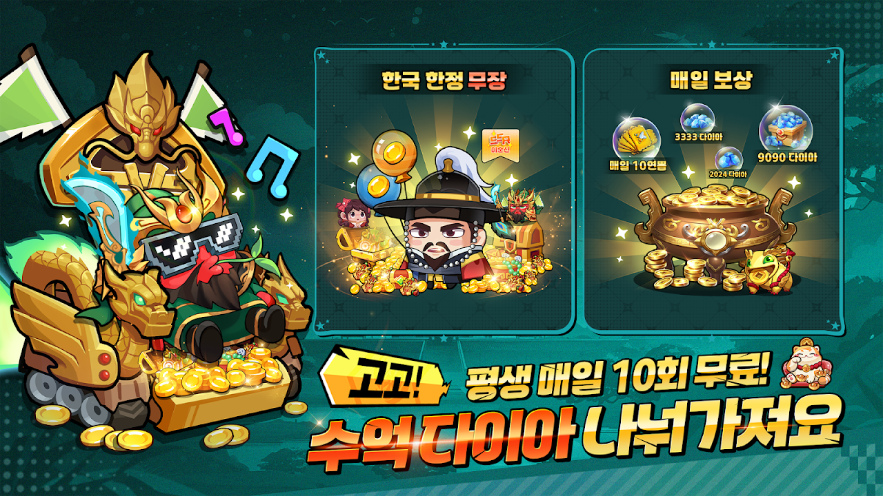 暢遊三國,享受前所未有的福利!所有新玩家不僅可以享受無限10連抽的特權,還有「分享1億韓元博」活動和各種遊戲內挑戰等著他們贏得9090韓元的獎勵。