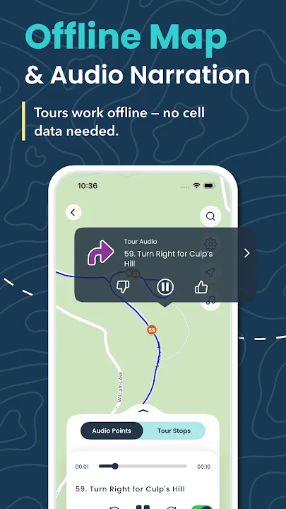 应用程序和地图完全离线运行。这意味着即使您没有数据或 Wi-Fi,我们仍然可以带您到达您想去的地方!Shaka Guide 导览永不过期——您可以多次使用,也可以将其分成多日游。下载葛底斯堡战场自驾游和市中心历史步行游✅