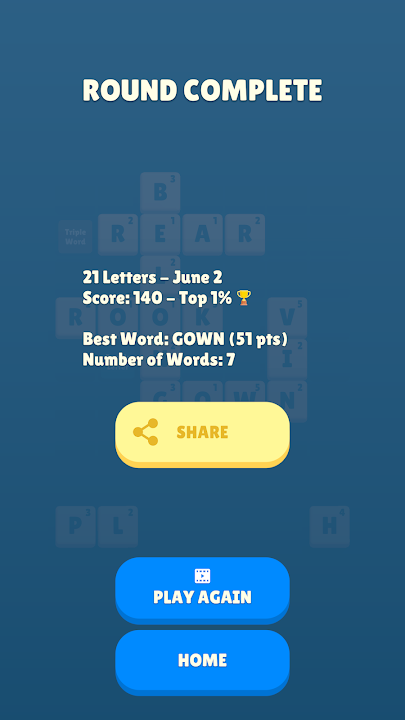 Share your score with your friends and family - since everyone has the same letters for any given day, every day is a competition!