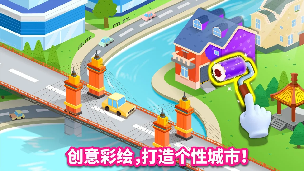 孩子在《宝宝建城市》中,可修建桥梁和7种建筑,分别是:摩天大楼、木头亭子、小别墅、工厂、百货商场、医院和学校。