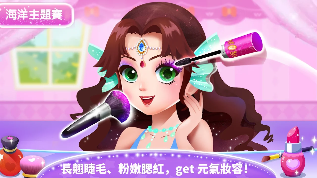 小朋友先來為白皮膚公主化個美美的妝:施以貼合膚色的粉底,塗上粉色眼影、畫道小山眉,再使用小刷子,將腮紅輕輕掃上臉頰……哇,元氣滿滿!