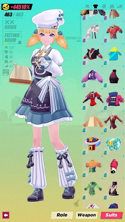 Dress Doris up! We designed various suits and weapons which allows you to match them to your own taste. Share them through social media!