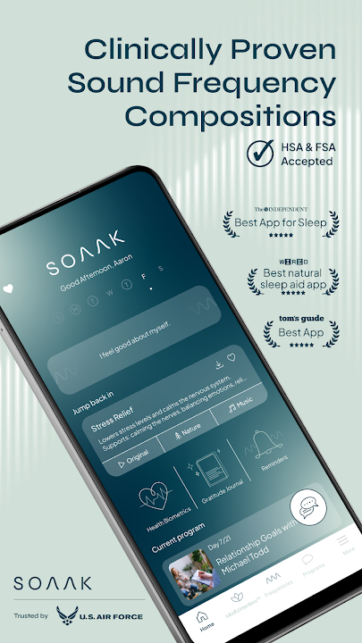 - Dual Audio: Enjoy Soaak's proprietary sound frequency compositions alongside your favorite audio content. Whether it's music, audiobooks, videos, white noise, or nature sounds, the dual audio feature lets you layer Soaak's frequency compositions in the background, enhancing your listening experience without interruption.