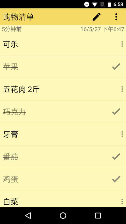 在“待办事项清单”模式中,你可以无限添加条目,在编辑时按住并拖动左侧的箭头标记可以上下移动条目。保存清单后,你可以进行标记,或者取消标记。被标记的条目将会添加删除线。当一个清单中的所有条目都被标记完成后,该清单的标题也会被添加删除线。