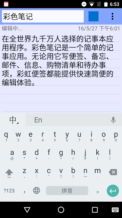 彩色笔记是一个简单的记事应用。无论用它写便签、备忘、邮件、信息、购物清单和待办事项,彩色笔记都能提供快速简便的编辑体验。用彩色笔记写笔记比其他所有笔记和备忘应用更简单!