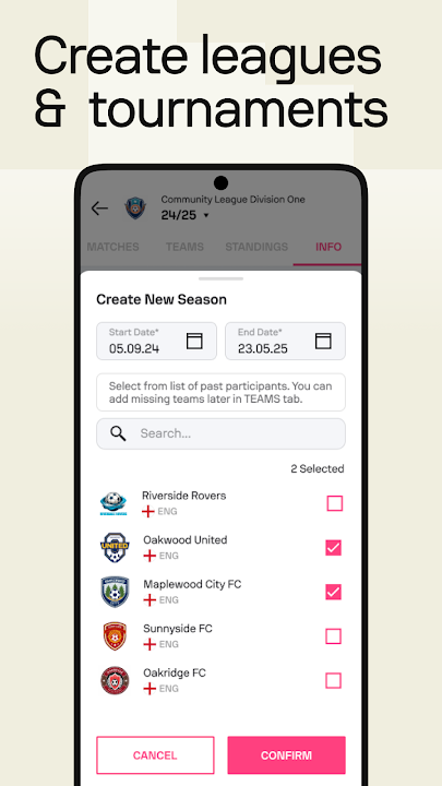1. Create leagues and tournaments β from one-off weekend tournaments to regular-season fixtures, and everything in between