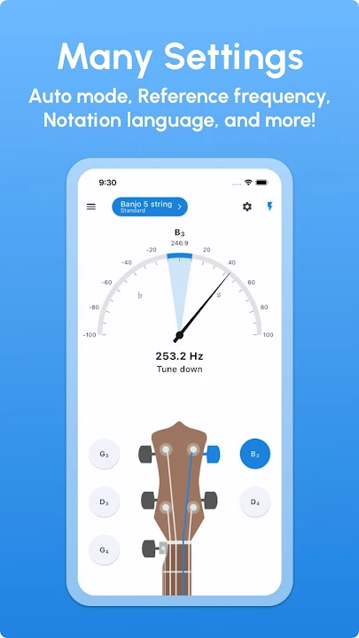 In this banjo tuner, you'll find many settings, such as: