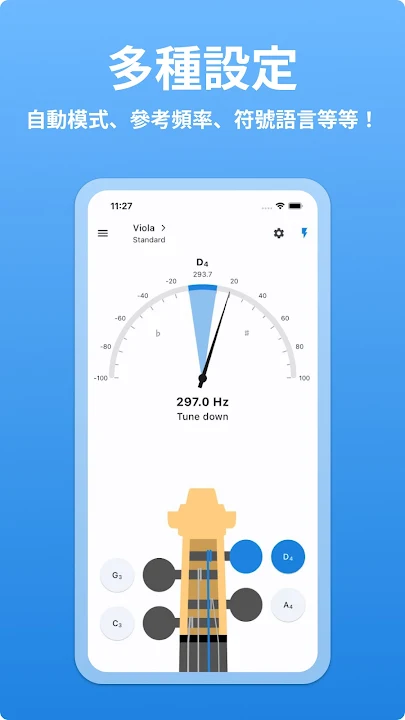 使用自動模式更快為中提琴調音。 您可以演奏任何音符,我們將正確檢測它,為您提供如何為中提琴調音的提示。