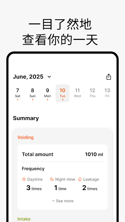 5. 每日摘要:排尿次数、漏尿、夜间排尿、总尿量