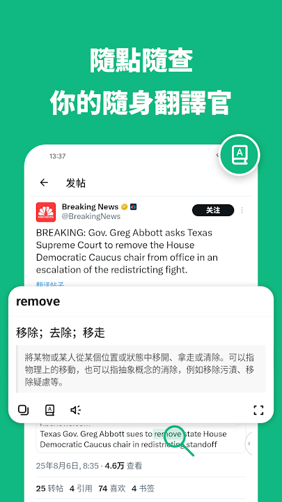 我們先進的翻譯技術和豐富的功能集,提供市面上最快速、最準確的翻譯。完美適用於手機遊戲、國際交流和語言學習!
