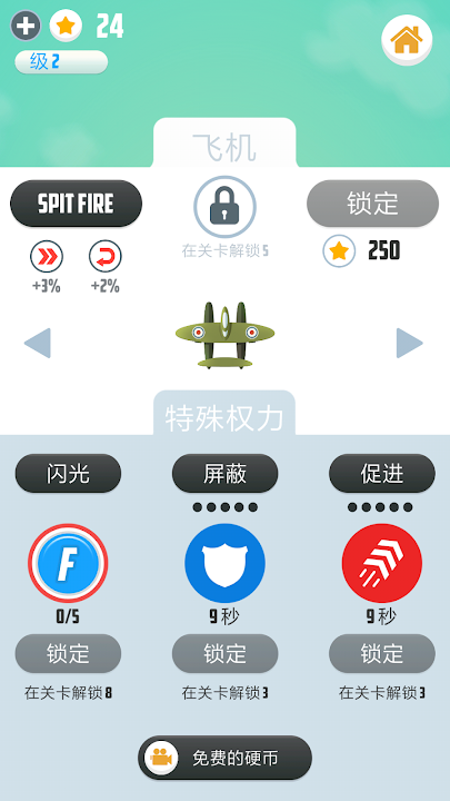 - 收集硬币,并在店铺里使用它们来购买新的飞机和升级的装备